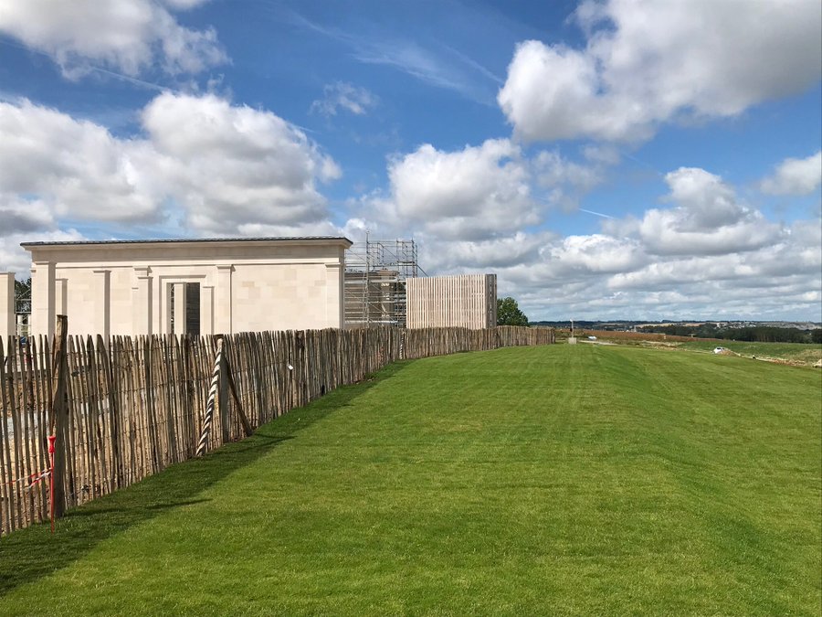 “The British Normandy Memorial is really taking shape now. I had the privilege of seeing the site today. It’s not open for visiting yet, but when it’s finished, it will take your breath away. The overall structure is becoming clearer now that the 8m high Memorial Court is out of scaffolding. And real English turf is being laid.