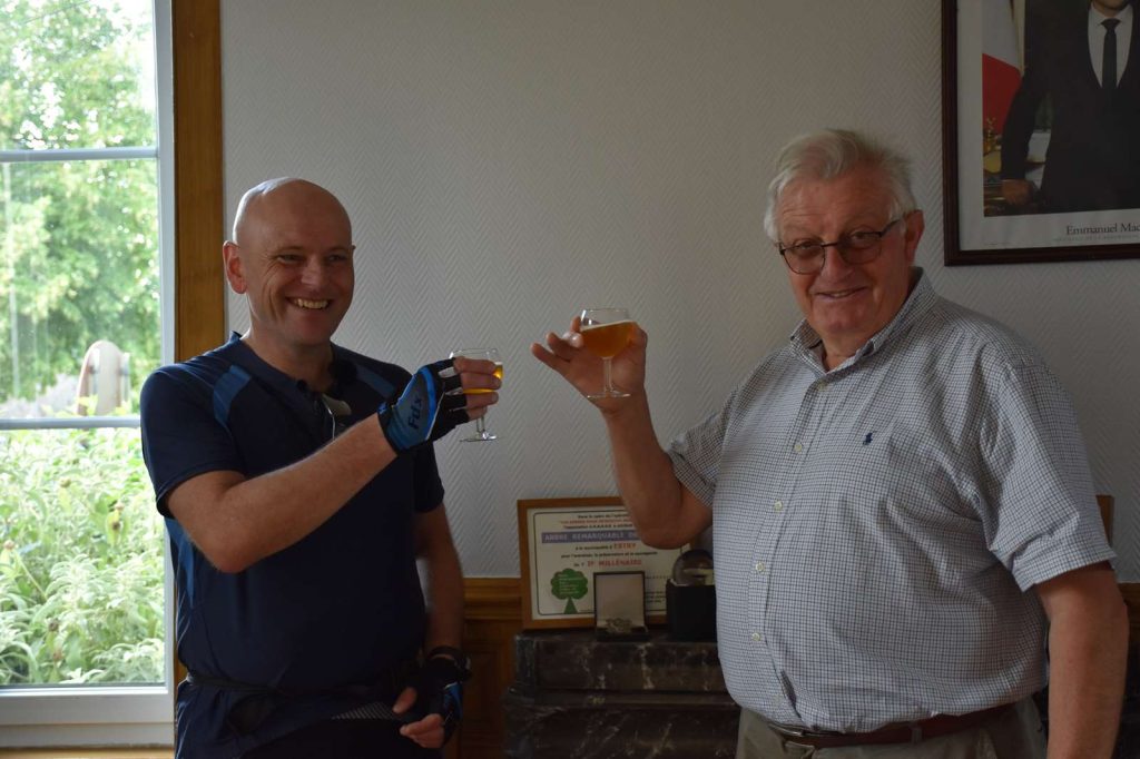 A key point enroute was the small commune of Estry where my grandfather was killed. Approaching from the east and covering his last steps was an emotional and proud moment. Waiting for me at the Mairie (town hall) was the Mayor, Gilbert Louis, with flag bearers and residents to mark the occasion. They only heard of my visit the night before, but kindly arranged a last-minute ceremony. George’s picture hangs in their Mairie as their adopted soldier.
