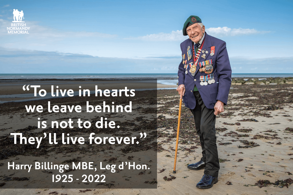 D-Day Veteran Harry Billinge MBE passed away aged 96 on 5 April 2022. He raised more than £50,000 for the Trust by collecting in his hometown of St Austell and was a champion of the regular giving Guardian Programme. His family asks that anyone who wishes to honour his legacy becomes a Guardian of the British Normandy Memorial in Harry’s name.