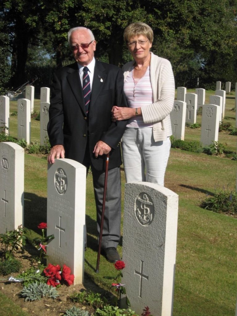 Val and Stan standing besides graves of the men of HMS Fratton and the grave adopted by Val in Ryes Cemetery, 2010