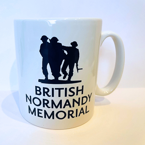 White classic earthenware mug with navy blue British Normandy Memorial Logo on each side.