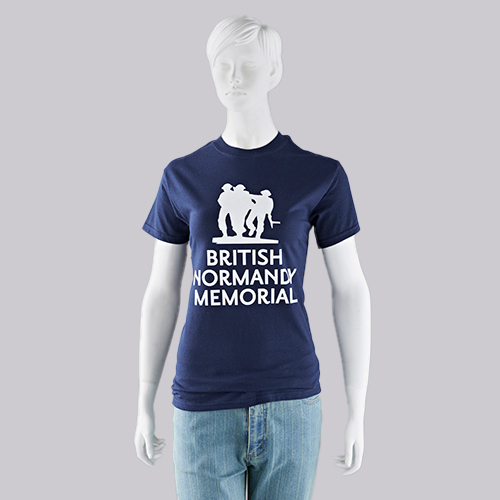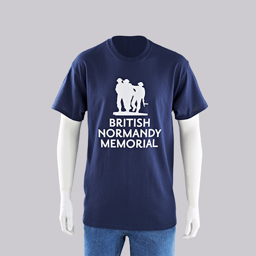 A 100% cotton navy T-shirt featuring the British Normandy Memorial logo in white on the chest. Available in S / M / L / XL