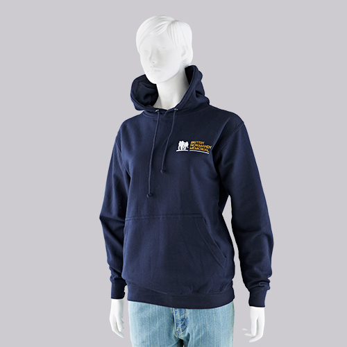 A navy blue unisex hoodie with British Normandy Memorial logo on he left.
